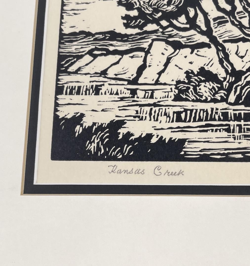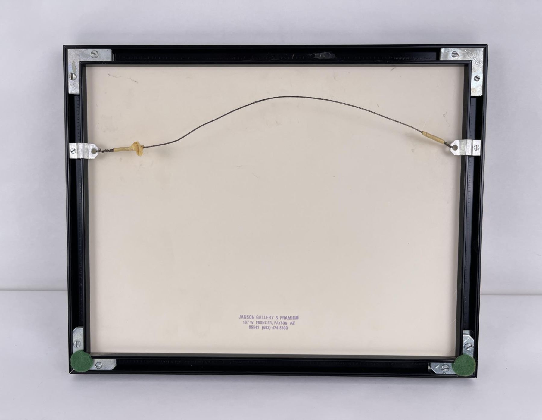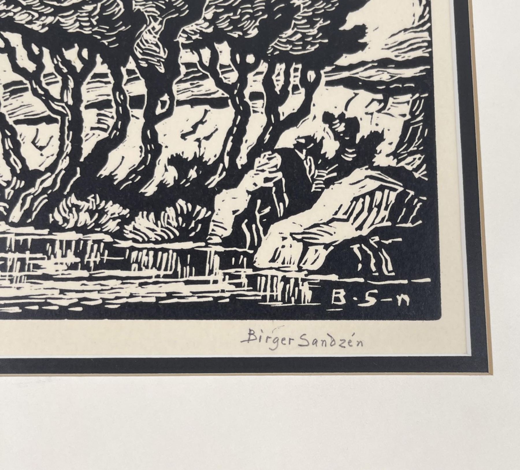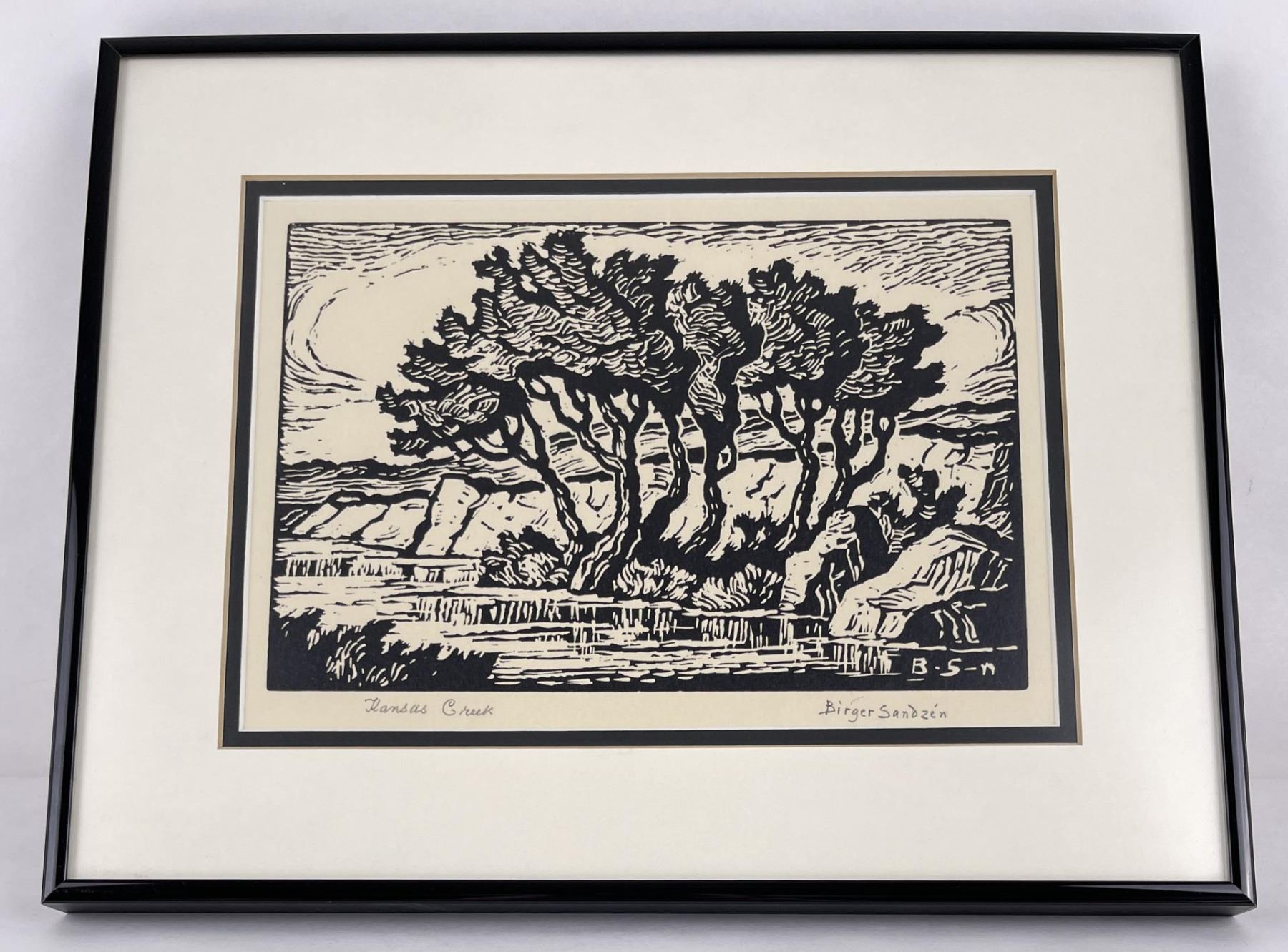 11" by 13 3/4" framed. Provenance: Gift from artist through decent. Birger Sandzen (1871 - 1954) was active/lived in Kansas, Colorado / Sweden. Birger Sandzen is known for Abstract richly colored landscape and still life painting. Born Blidsberg, Sweden, Feb. 5, 1871; died Lindsborg, June 19, 1954. Painter, specialized in landscapes. Etcher. Engraver. Lithographer. Teacher. Attended the College and Academy of Skara as a pupil of Olof Erlandsson. After graduation from Skara College, Sandzén spent a semester at Lund University attending art history lectures and continuing the study of French. Following Lund University he went to the technical high school at Stockholm, where he studied perspective and form drawing. Sandzén joined a group of young artists and they rented a studio at Anders Zorn's suggestion. They received instruction from Zorn as well as Richard Bergh, a well-known portrait painter and Per Hasselberg, one of Sweden's best sculptors. Sandzén then went to Paris to study with Aman Jean, where he began to associate with American students in the French studies. On returning home in 1894, a family friend sent Sandzén a booklet about Bethany College, Lindsborg and the town called "Little Sweden." Sandzén moved to Lindsborg in 1894 to teach French, voice, art history, drawing and painting at Bethany College where he remained on the faculty until 1946. He first painted in the Colorado Springs, CO area in 1916, and became a frequent visitor to Santa Fe and Taos, NM beginning in 1918. Sandzén spent the summers of 1923-24 teaching at the Broadmoor Academy in Colorado Springs (presently the Colorado Springs Fine Arts Center). Sandzén also taught at Chappell House (the forerunner to the Denver Art Museum), Utah State Agricultural College, Stephens College, the University of Michigan, and the 188 Kansas City Art Institute. Sandzén's style of painting is unusual in its thick and heavy application of impasto in bold and bright color combinations, interpreting the landscape of the western United States. He is known for very colorful renderings of mountain lakes with boulders, cypress and aspen trees and moonrises along waterways. Sandzén was an important advocate for art in the region, spending time talking to people about art, organizing exhibitions and establishing art clubs. He donated artwork to the local art club to help raise money for the purchasing of art books for the library, the financing of exhibitions, and the occasional awarding of a scholarship. He painted murals for the Halstead Post Office, Where Kit Carson Camped, in 1941, for the Lindsborg Post Office, Smoky River, in 1938, and for the Belleville Post Office, Kansas Stream, in 1939. He illustrated three books, With Brush and Pencil (1905), In the Mountains, (1925), The Smoky Valley, (1922).