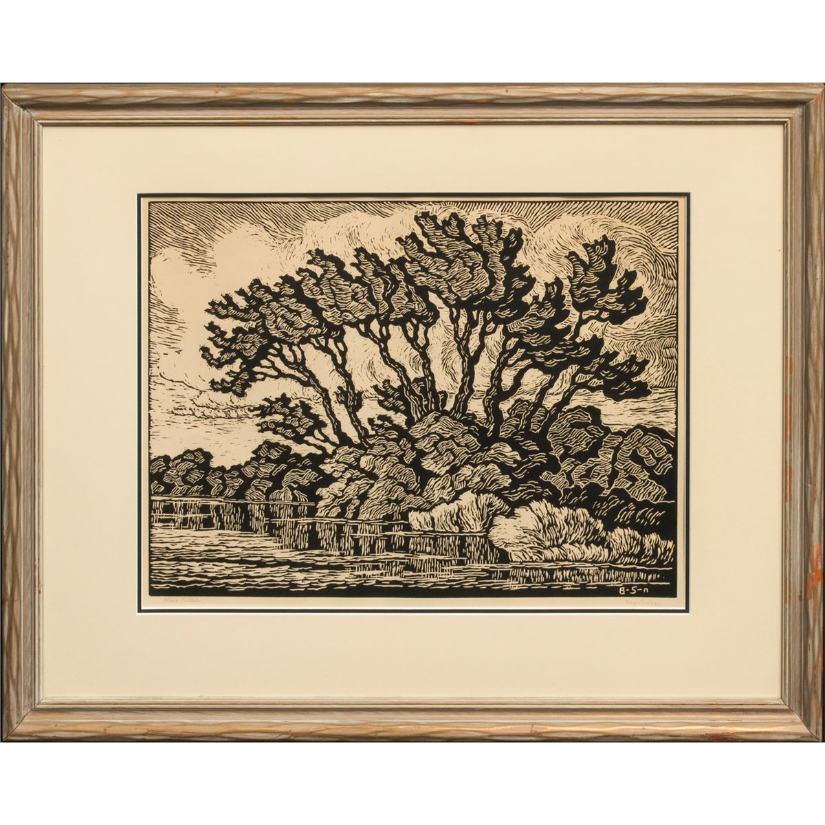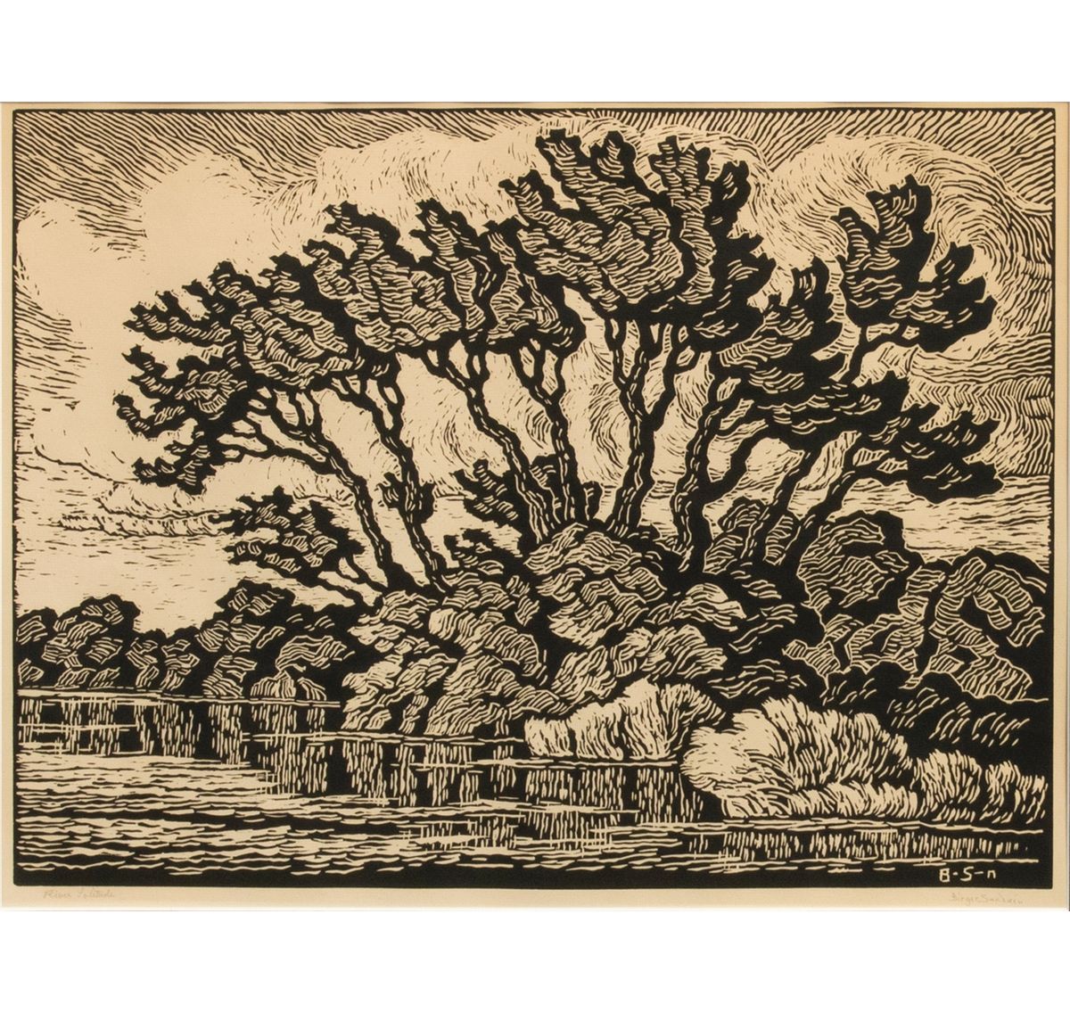 Birger Sandzen (1871 - 1954). River Solitude. 15.0625" x 19.9375" linoleum cut. Signed lower right margin: Birger Sandzen. Titled lower left margin. Printed in 1941. Provenance: Bethany College, Lindsborg, KS.