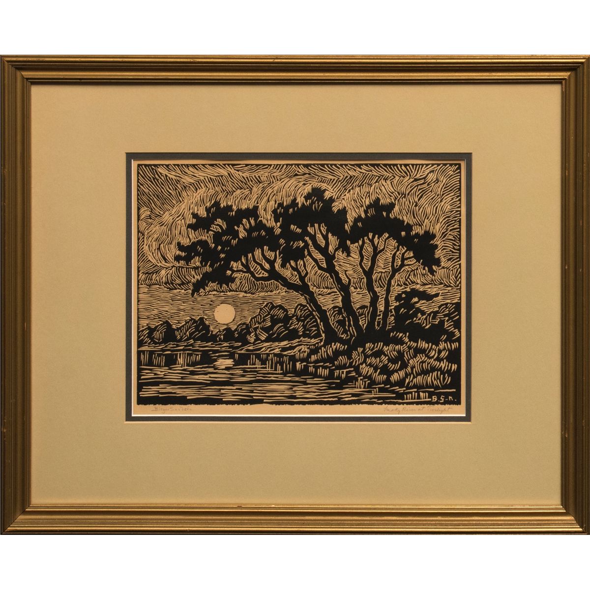 Birger Sandzen (1871 - 1954). Smoky River at Twilight. 8.9375" x 12" linoleum cut. Signed lower left margin: Birger Sandzen. Titled lower right margin. Printed in 1928. Provenance: Bethany College, Lindsborg, KS.