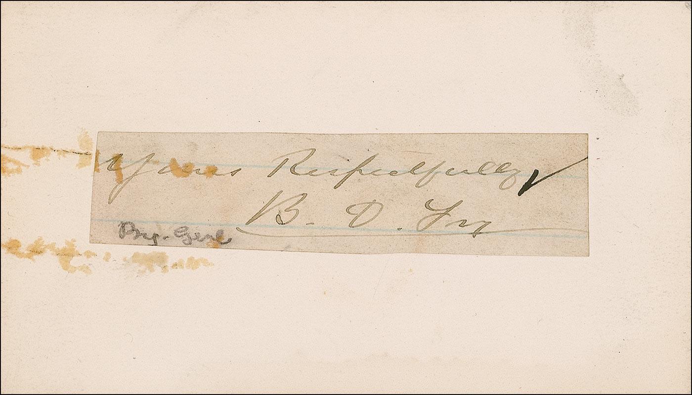 Confederate general (1822–1891) who commanded one of the lead brigades during Pickett's Charge at the Battle of Gettysburg. Ink signature, “B. D. Fry,” on an off-white 2.75 x .75 lightly-lined slip affixed to a 4 x 2.25 card. In very good condition, with soiling and staining from tape or glue residue to the left of the signature.