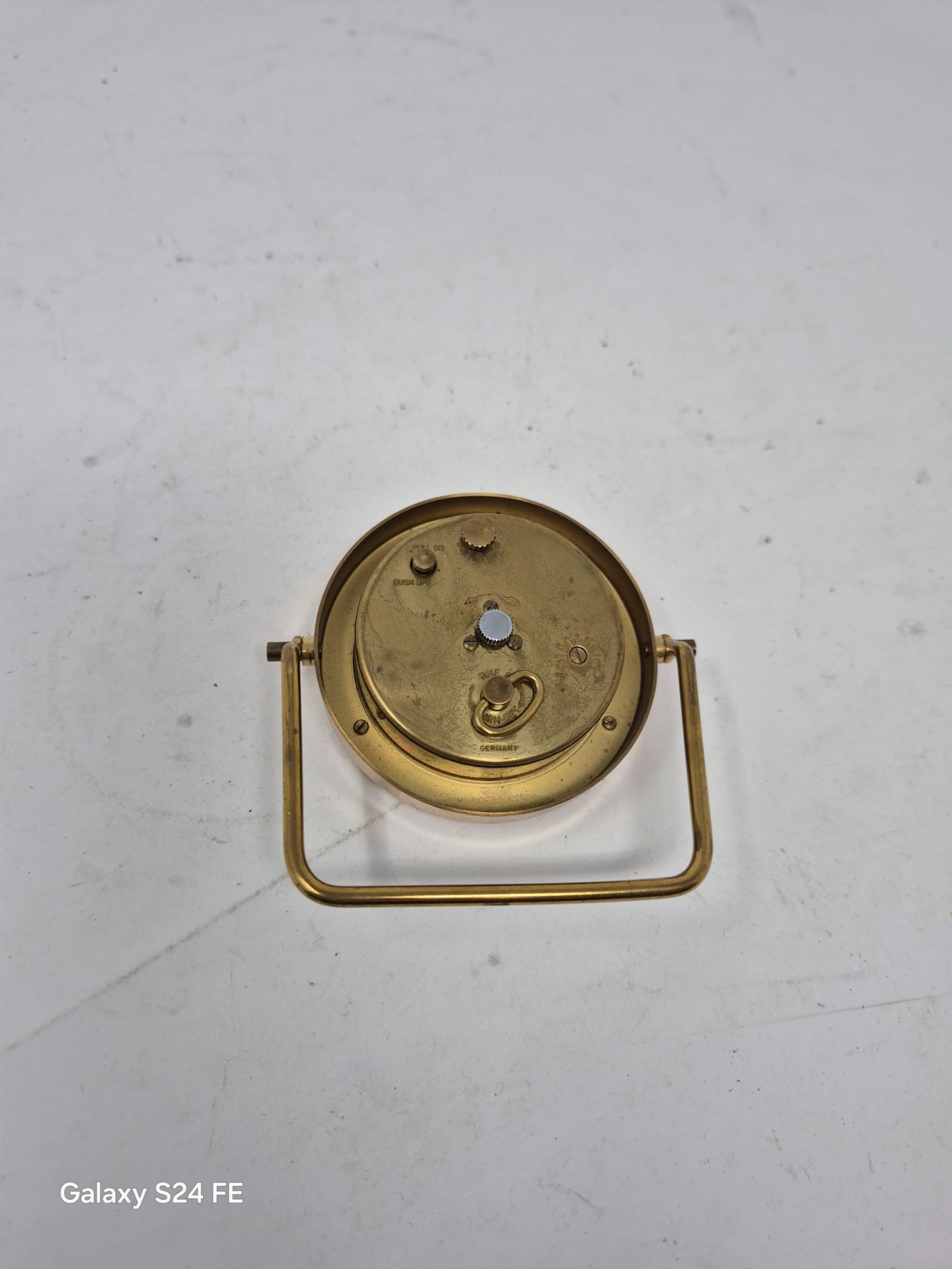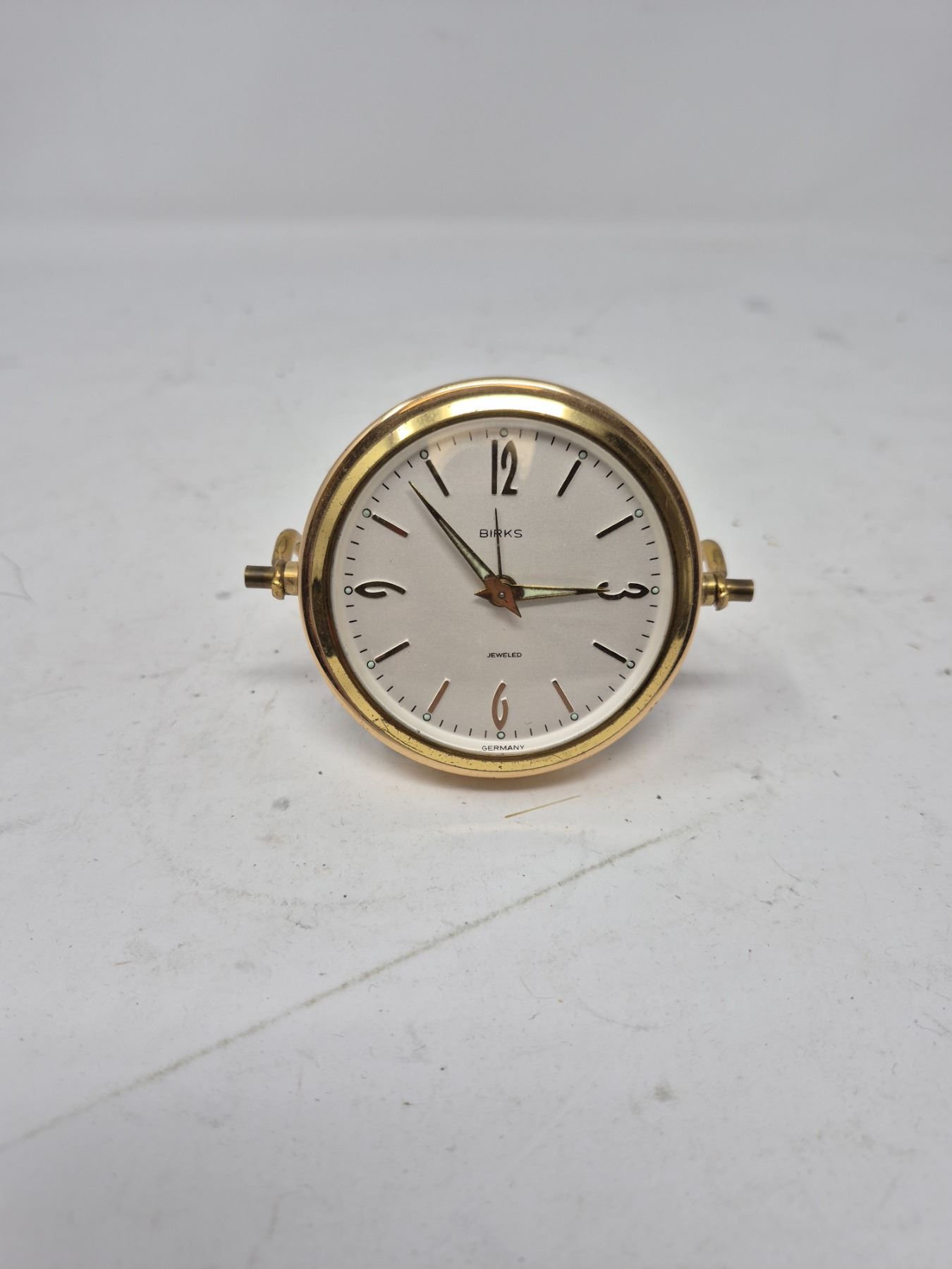 Classic vintage brass 8-day mechanical travel clock by Birks. Marked "Germany" and "Jeweled." Unverified working condition.