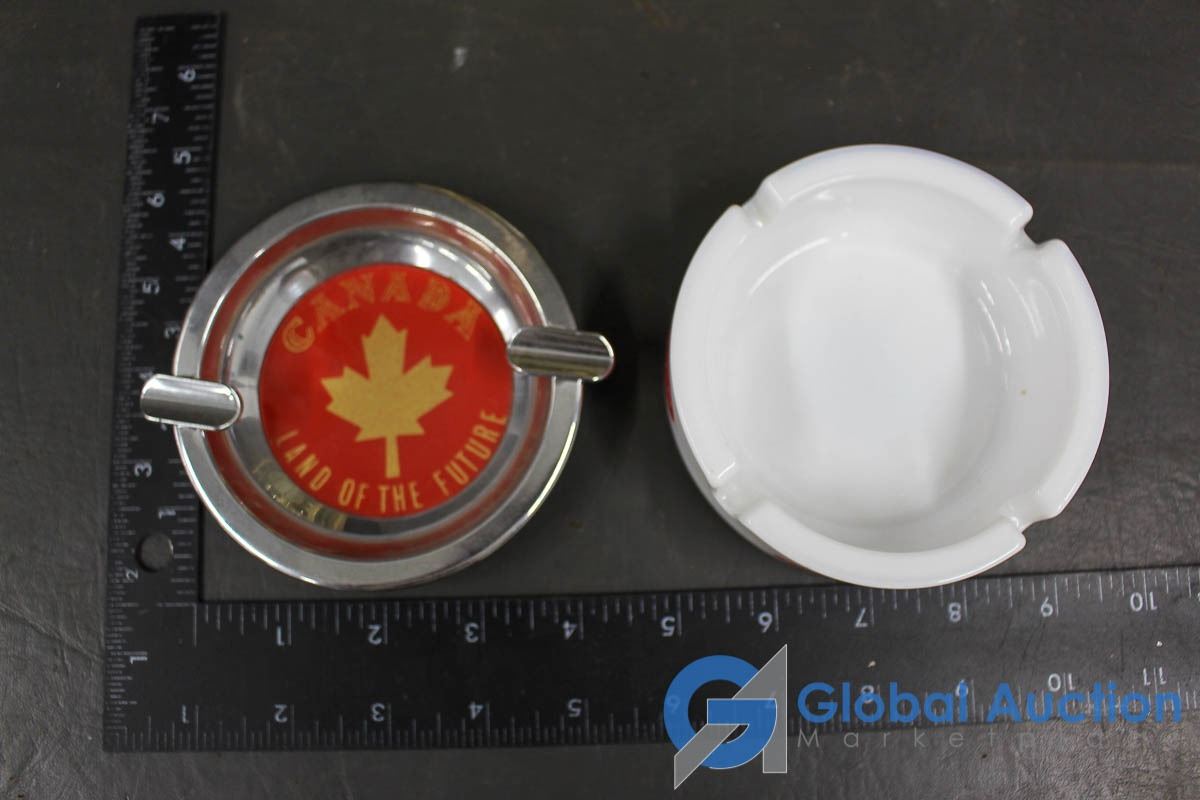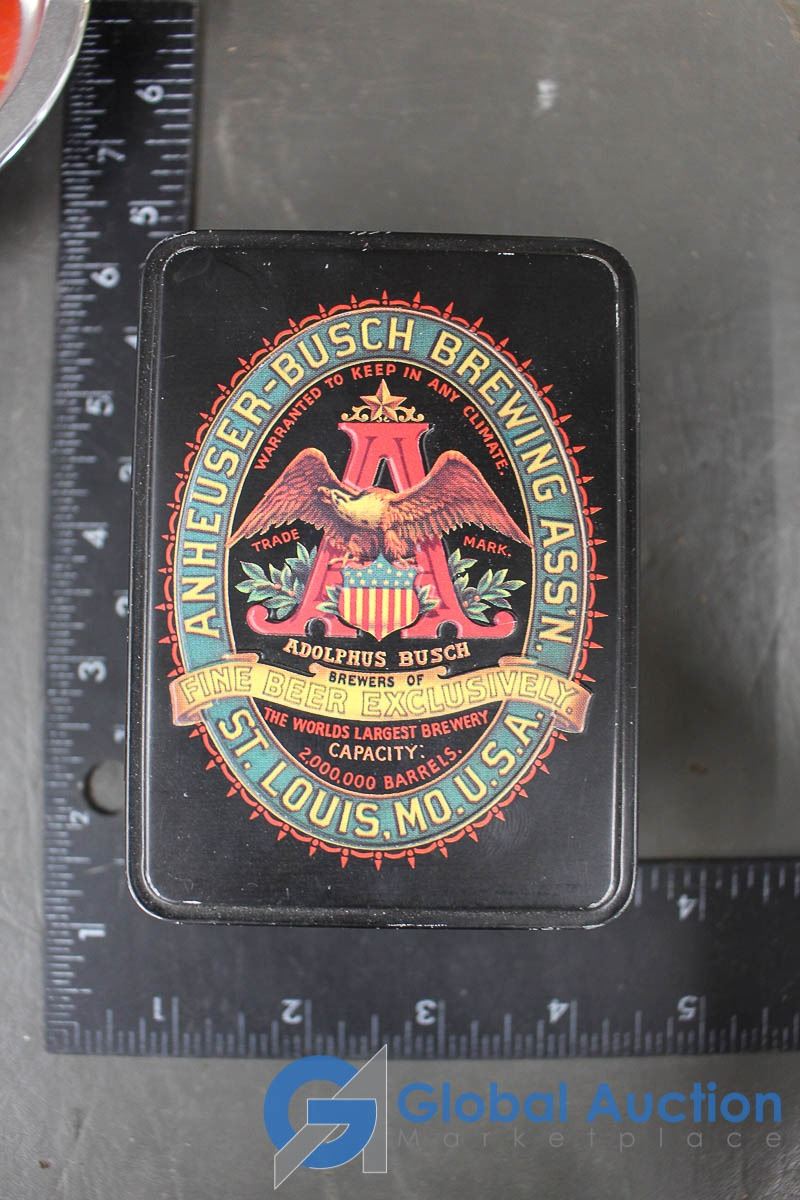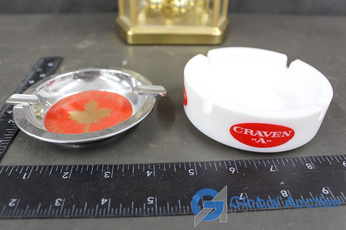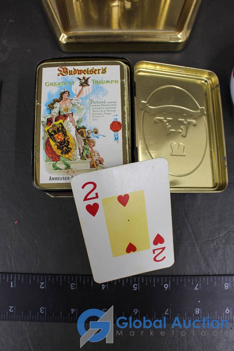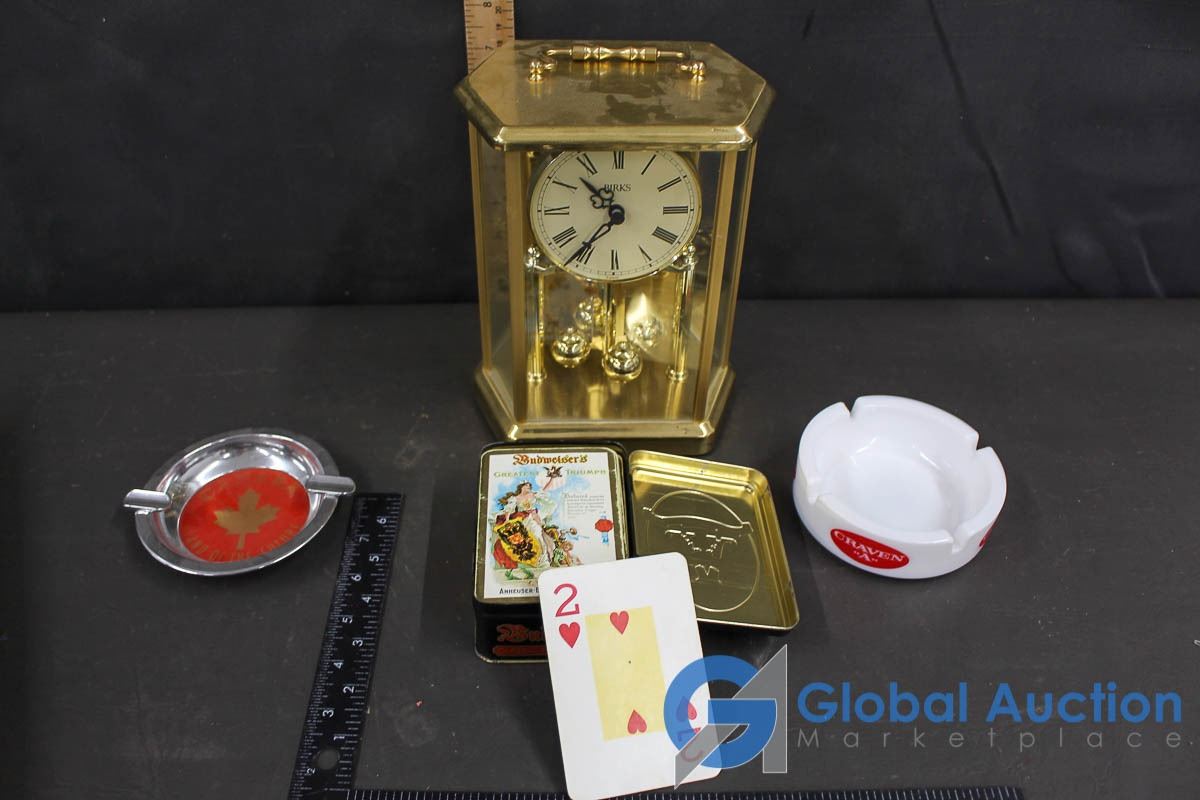 Birks Clock within Glass Case, Craven"A' Ashtray, Metal Canada Ashtray, Budweiser Classic Playing Ca