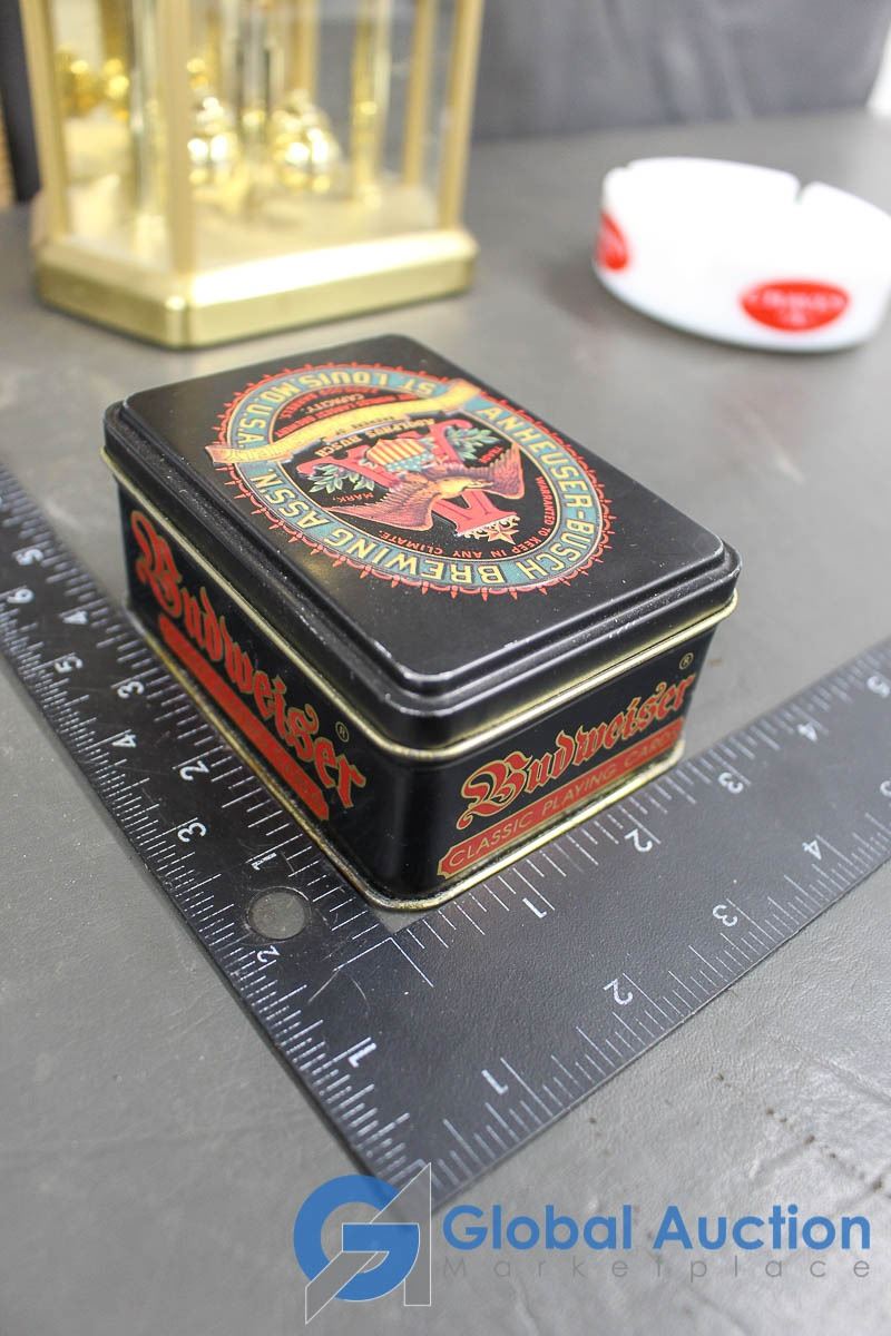 Birks Clock within Glass Case, Craven"A' Ashtray, Metal Canada Ashtray, Budweiser Classic Playing Cards within Tin Box