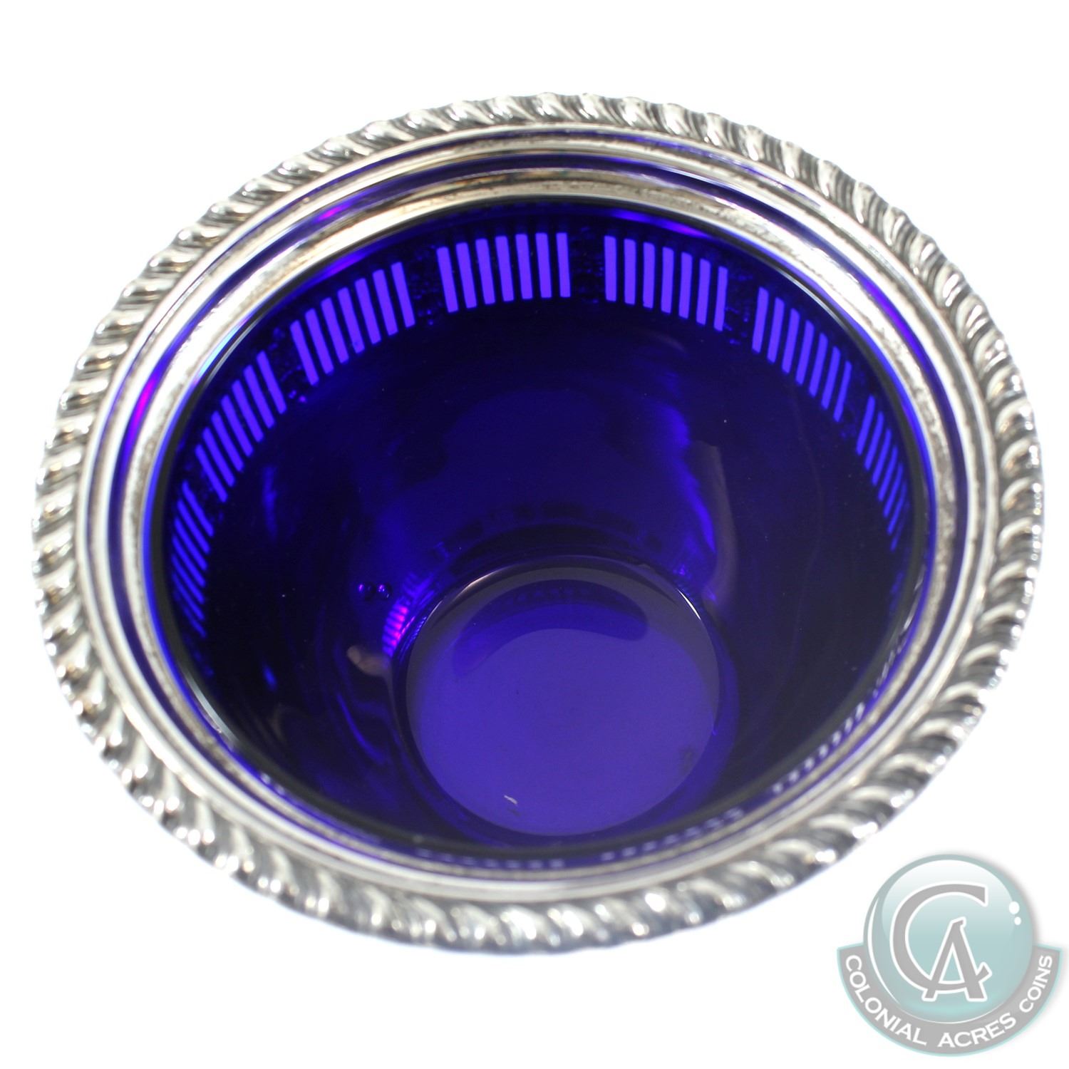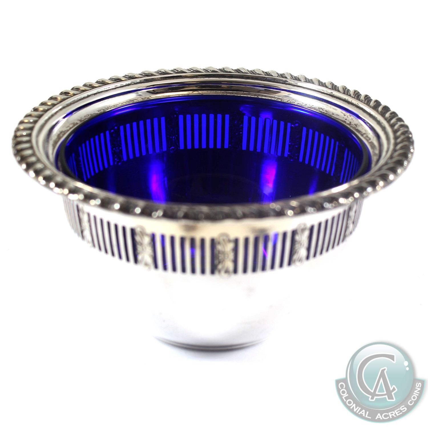 Birks Sterling Silver Pierced Bowl with Gadroon Design and Cobalt Blue Glass Liner. Bowl measures 2 1/2" in height with a total weight of 92.18 grams (without glass liner).