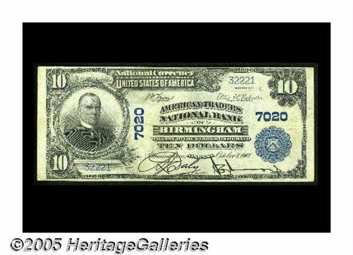 <B>Birmingham, AL</B></I> - $10 1902 Plain Back Fr. 624 <B>American-Traders NB </B></I> Ch. # 7020<BR>The variety with two bank serial numbers rather than one bank and one treasury number. A bright and crispy <Extremely Fine</B></I>.