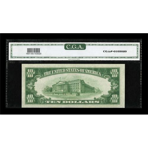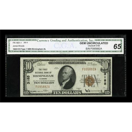<B>Birmingham, AL</B></I> - $10 1929 Ty. 1 <B>The First NB</B></I> Ch. # 3185<BR> The front to back centering is ideal and the margins are full on all four sides. <B>CGA Gem Uncirculated 65.</B></I><BR><BR><b>Shipping:</b> Coins & Currency (<a target="_blank" href="http://www.heritageauctions.com/common/shipping.php">view shipping information</a>)