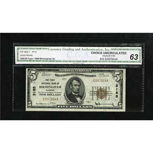 <B>Birmingham, AL</B></I> - $5 1929 Ty. 1 <B>The First NB</B></I> Ch. # 3185<BR>A tight top margin is the reason for the grade on this original note. <B>CGA Choice Uncirculated 63.</B></I><BR><BR><b>Shipping:</b> Coins & Currency (<a target="_blank" href="http://www.heritageauctions.com/common/shipping.php">view shipping information</a>)