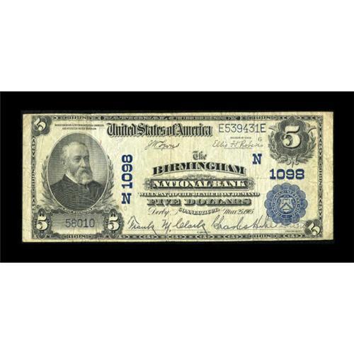<B>Birmingham, CT</B></I> - $5 1902 Plain Back Fr. 598 <B>The Birmingham NB</B></I> Ch. # (N)1098<BR> The paper is original and free of problems. The stamped signatures remain bold. <B>Fine.</B></I><BR><BR><b>Shipping:</b> Coins & Currency (<a target="_blank" href="http://www.heritageauctions.com/common/shipping.php">view shipping information</a>)