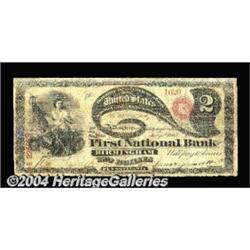 Birmingham, PA - $2 Original Fr. 387 The First NB Ch. # 926Listed in the Kelly reference as a Pittsburgh issue, but the note indicates otherwise, as does the title, which would have given Pittsburgh two First National Banks. This Lazy Deuce could well be the sole example of its type reported from here (it's listed in the census without serial number). Very Good in appearance, with bright colors for the grade, but with a few small tape repairs and some reinforcement of the top margin. <BR><BR><B>Important notice:</B> Heritage usually auctions material at the rate of 200-250 lots per hour. On some occasions eBay Live bid software or the Internet may not be able to keep up with the pace of the auction. We recommend placing a realistic absentee bid now as insurance to avoid disappointment. Occasionally the auctioneer may eliminate or reject an eBay Live bid, and the auctioneer may also reopen a lot after the close of the eBay live bidding (usually because we missed an audience bid), and may reject your bid even if it shows you as the winning bidder. By bidding via eBay Live, you agree that Heritage may award the lot to another bidder at its sole discretion under the circumstances described above or any other reasonable circumstances. Since eBay bids are not shown to us until we open the lot on the floor, we treat those bids just like floor bids. In most cases the floor responds before the eBay bid is presented to us, due to Internet lag time, so for consistency we have made it a policy that floor bids are always considered first over tie eBay live bids. Also please note that all Heritage lots purchased through eBay Live carry a 20% Buyer's Premium. Please make sure you read the Terms and Conditions before you bid. <BR><BR><B>IMPORTANT ANNOUNCEMENT ABOUT RESERVES:</B> Heritage now divulges all reserves on its web site 7 days before every auction. If you want to know whether the reserve on this lot has been met, and if not, what the reserve amount is, please visit this lot page on the HeritageCoin.com web site, or email: bid@HeritageGalleries.com