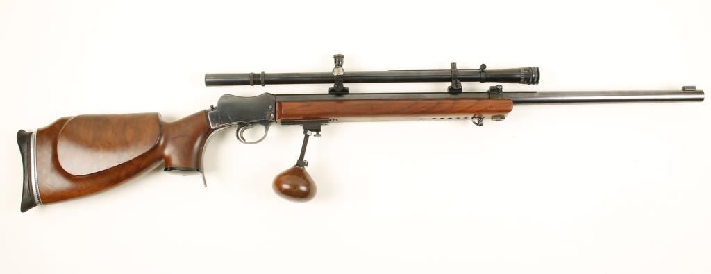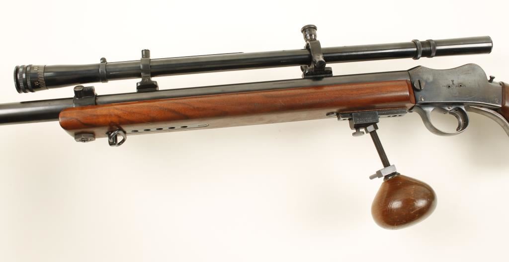 Blued single-shot slope-block Martini lever-action rifle with a 28" heavy bull barrel with a recessed target crown, off-hand palm rest and a Lyman "Junior Targetspot" 8X scope. "Kenneth L. Hooper" is cut into the barrel. Bluing is good with some edge wear and specks of surface rust. The polished bluing of the receiver has many scratches and a few dings. There is no cocked indicator. Lever is made to fit the stock. Recoil pad is adjustable in 2 axes. Butt stock is for a left hander from select or deluxe wood and has checks, scratches, rubs and dings. The forend is a beavertail with a rail to accept the palm rest, an Al Freeland floating barrel fixture and another set of threaded holes for rests, weights, etc. Action works well. Bore is mirror bright. Condition is very good. *Modern Firearm*