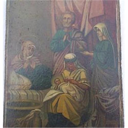 19th. century Russian icon, egg tempera on wooden board. Depicts Jesus as infant with Mary and Joseph praying. High quality of painting. Circa 1870. Size: 10 inches x 8.5 inches. Estimated value: $7.500.