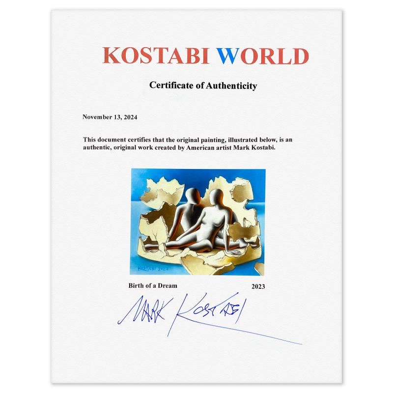 "Birth of a Dream" is an original oil painting on canvas by Mark Kostabi, hand signed by the artist. This piece comes framed. Includes Certificate of Authenticity. Measures approx. 18.5" x 20.5" (frame), 10" x 12" (image). Due to handling, There is a faint scratch on the top-left frame corner that is only noticeable upon close inspection. This item requires special handling and may have a longer than usual turnaround.