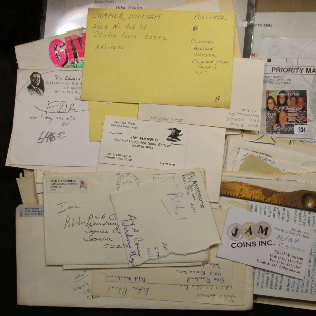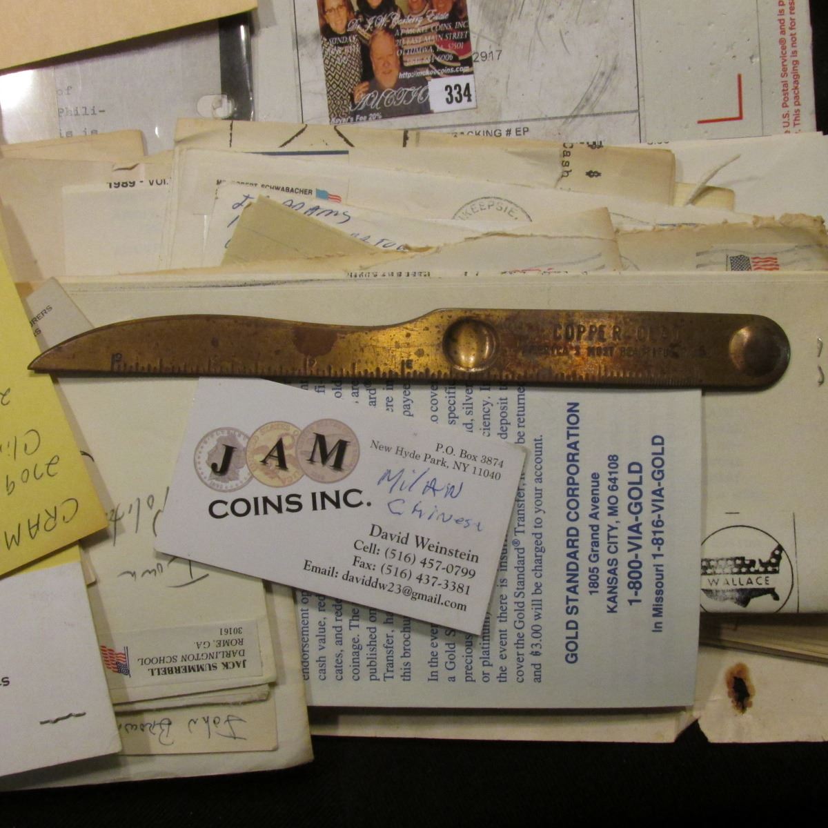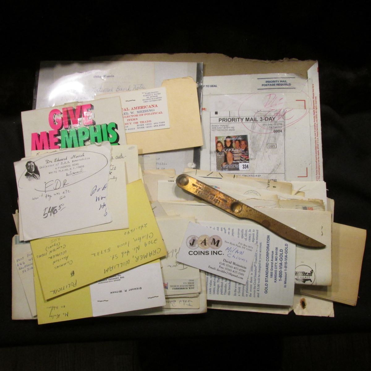 Birthday Greeting Card in design of baker with slide in tabs; John Moskow L.B.J. Want list; various pieces of correspondence from A & A coins to customers including correspondence in regard to National Bank notes; group of business cards; and a brass ruler/letter opener advertising "Copper Clad America's Most Beautiful Range".