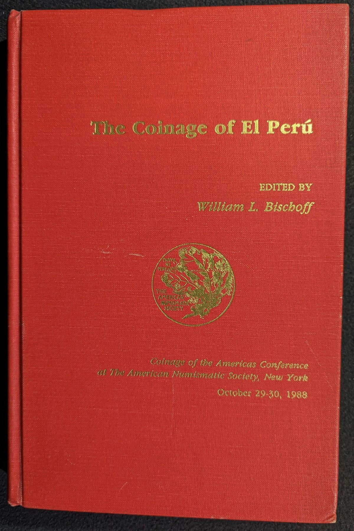 Bischoff, William L. (Ed.). THE COINAGE OF EL PERU. The American Numismatic Society, New York. 1989. 12mo. xv, (1), 250 pages. Original red cloth, gilt. Illustrations throughout. Tables. Fine. This book is an anthology of 14 papers presented at the Coinage of the Americas Conference at The American Numismatic Society, New York October 2-30, 1988. The prime focus of each paper being some aspect of the coinage of Peru from the 16th century to the present. Lot weight: 1 lbs 9oz. Subject(s): Peruvian Coinage.