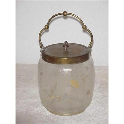 A Victorian glass biscuit barrel, 6 1/4" tall 5 1/2" in diameter. The lid and handle were originally silver plated but most of the silver is gone, the jar has a crackle finish to the glass and there are enameled flowers that appear to have had a hard life as a lot of the enameling has worn off, the bottom is polished and the jar is still lovely if a bit worn. (2)
