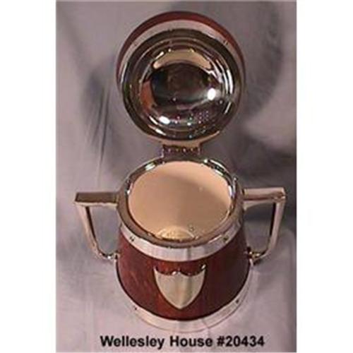 An excellent condition Oak two Jug Handled Biscuit Barrel. It has a hinged top, large Silver Plate Shield and Bands.