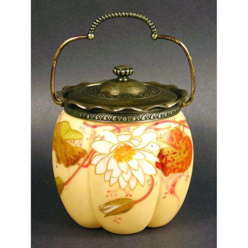 Biscuit Jar with lion shield mark on bottom. Silver plated bale and lid. No chips or cracks. 6 1/2 X 6 1/2 inches.