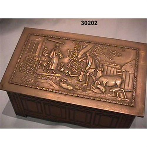 The sides of this tin are embossed to simulate carved wood and the lid has a thin sheet of embossed brass applied to it. (See M J Franklin ref: 265)