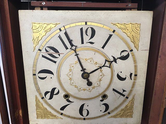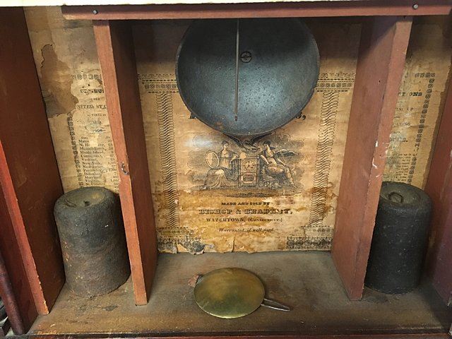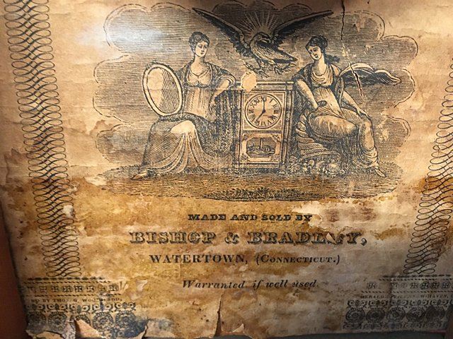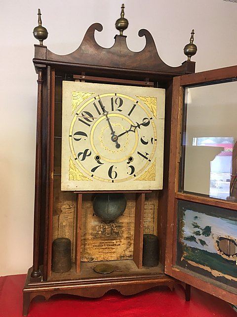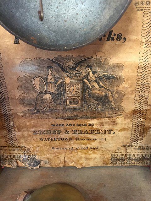 Rare Antique Bishop and Bradley Mahogany pillar and scroll clock, Watertown, Connecticut, c. 1825. Scroll top case with turned columns, reverse painted glass tablet, hand painted dial, 3 brass urn finials, wooden works, weight driven, thirty-hour clock. Very nice label, "Made and Sold by Bishop & Bradley, Watertown (Conneticut). Measures approx. 31" tall x 17" wide x 4" deep.