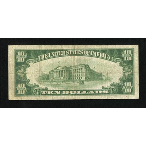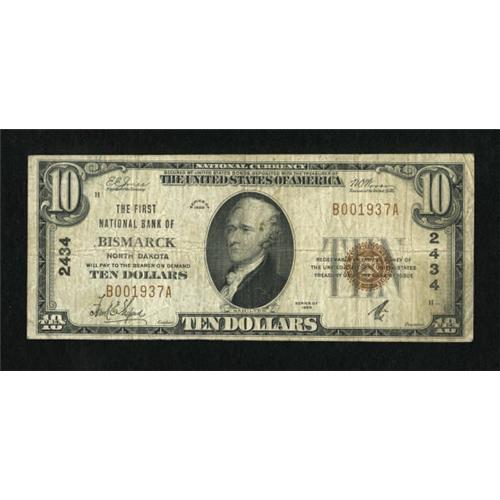 <B>Bismarck, ND</B></I> - $10 1929 Ty. 1 <B>The First NB</B></I> Ch. # 2434<BR> This capital city bank opened in Dakota's territorial days and remained throughout the rest of the note issuing period. This <B>Fine</B></I> example, while it does have a couple of pinholes and a small stain, it also comes with the tiny signature of, appropriately, President Little.<BR><BR><b>Shipping:</b> Coins & Currency (<a target="_blank" href="http://www.heritageauctions.com/common/shipping.php">view shipping information</a>)