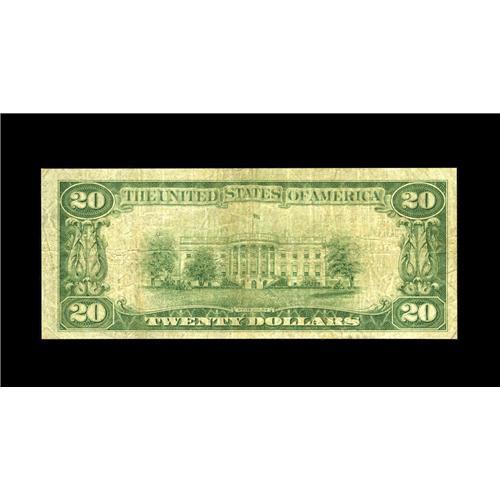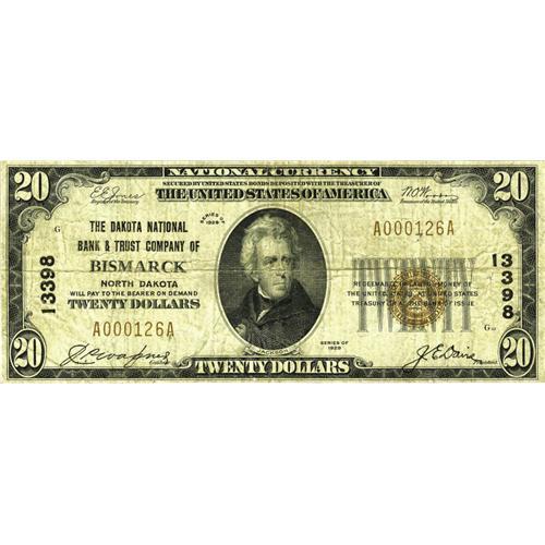 <B>Bismarck, ND</B></I> - $20 1929 Ty. 1 <B>The Dakota NB & TC</B></I> Ch. # 13398<BR>This $20 has sound edges and it is problem-free for the grade. <B>Very Good-Fine</B></I>