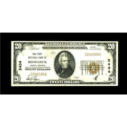 <B>Bismarck, ND</B></I> - $20 1929 Ty. 1 <B>The First NB</B></I> Ch. # 2434<BR>A well centered <B>Very Fine+</B></I> with claims to the next higher grade. Our FUN 2003 auction included a VF of this type and denomination not as visually appealing as this nice example. It sold for $690.00, a figure this offering will surpass based on its superior eye appeal. Ironically, the extraordinarily small signature at bottom right is that of President Little.<BR><BR><b>Shipping:</b> Coin/Currency (<a target="_blank" href="http://www.heritageauctions.com/common/shipping.php">view shipping information</a>)