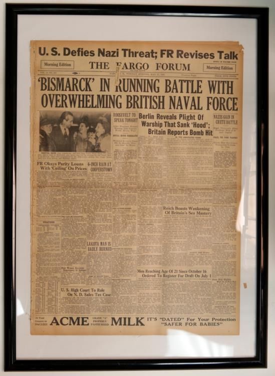 We present you with a framed front page newspaper headline from The Fargo Forum, "'Bismark' In Running Battle With Overwhelming British Naval Force," published on May 27, 1941. This clipping is mounted in a 21" x 29" black frame and comes from an estate collection. This nerve racking WWII era front page headline shook the American people who were fearing the worst about the United States involvement in the war.