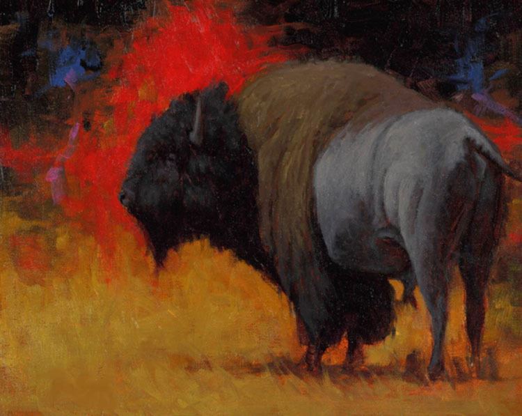 Artist: Tobias E. Sauer.  Title: Bison #7, by Tobias E. Sauer.  Size: 8" x 10".  Description: "As a former ranger at Yellowstone National Park, I have a great appreciation for the bison, and am constantly striving to capture its essence in my paintings.  In this painting, the bold, passionate red that surrounds the bison echoes the drama and the devastation that has surrounded the bison in the last 200 years of its history.  Yet for thousands of years, and especially through the calamity of the more recent past, the bison remains standing, majestically, a symbolic icon of our nation." -T.E.S.
