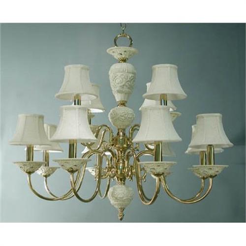 Height: 27" Width: 30" Extension: N/A Bulb: 12 - 60W Candelabra This chandelier is featured in Polished Brass with Fine Bisque Porcelain. Only the highest quality solid brass parts are used. Handsewn silk shades. (Can be purchased without shades) CHAIN: 2ft. Supplied Available Finishes Polished Brass Click to Enlarge <BR>Free Shipping in the continental US