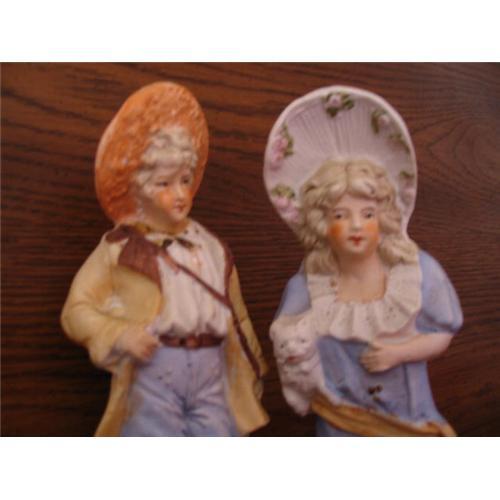A very old German piece of a charming country boy and girl. The boy has a satchel slung over his shoulder which could be holding the doggie treats that the pouty frauline wants to give the ancy pup she is holding in her arm. The bonnet and hat are just a final touch to accentuate this couple. Outstanding.