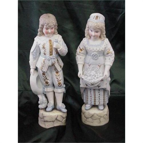 Pair of Bisque Porcelain figures. Man and woman 15 1/2" tall x 5 1 /4" wide. Unmarked. Probably made in Japan.