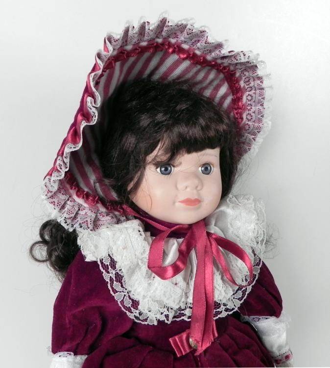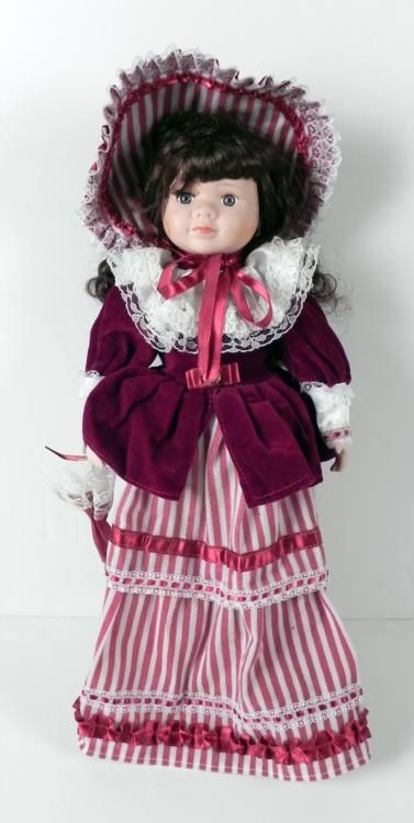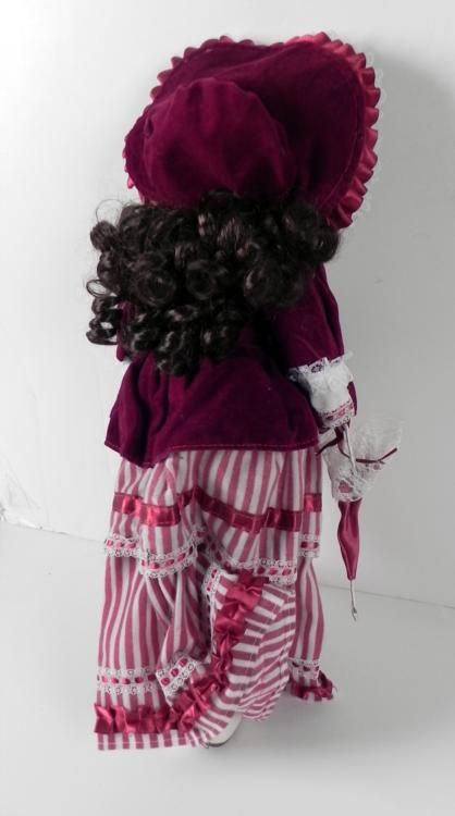 This 18 inch porcelain bisque girl doll wears a sharp looking 19th century holiday outfit, in cranberry/purple velvet with white lace trim, bold white and cranberry stripes, and velvet and lace hat. She also has a lacey umbrella which she holds in her * right hand. Her features include dark brown hair, and blue gray eyes. She is in excellent condition. * * * This doll has stylish 19th century look.