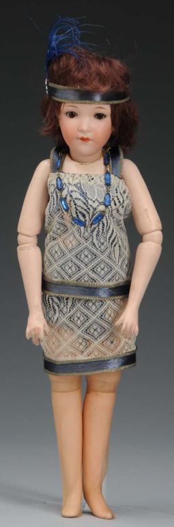 Description Armand Marseille closed mouth young lady doll incised "Armand Marseille Germany 401". Closed mouth, brown glass sleep eyes, upper and lower painted lashes, and fully-articulated slender lady body with straight wrists and joints above the knees. Appropriately redressed. Some paint touchup to the neck socket, right arm of the body, and upper areas of the thighs along with a miniscule cheek rub and slight loss of color to nose tip. Condition (Very Good). Size 14" T.