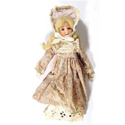 Bisque headed West German doll with open mouth and teeth in dress and bonnet, marks to back of head, 30cm high