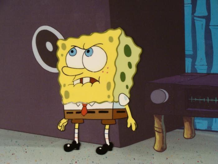 This animation cel and reproduction background are from the Nickelodeon TV show SpongeBob Squarepants. The story takes place under the deep blue sea in Bikini Bottom, where SpongeBob resides. SpongeBob, who is a yellow, porous sponge, is your typical happy-go-lucky character, as he is always cheerful and enjoys making people laugh. Patrick Star, SpongeBob's neighbor who is a starfish, is your average children's show idiot, as he boasts knowing nothing and is often getting himself into ridiculous situations. Between the homes of these two lies the home of the miserable Squidward, a squid, who is known for being grouchy and playing tricks on SpongeBob and Patrick. Both SpongeBob and Squidward work at the Krusty Krab, a fast food business run by the greedy money-loving Mr. Krabs, a crab, the arch rival of the evil, possibly misunderstood, Plankton. Another neighbor, Sandy Cheeks, an athletic squirrel who normally wears an astronaut's space suit, was introduced in "Tea at the Treedome." She spends most of her time inventing and experimenting. Why is SpongeBob biting his lip?Original Printed Background and Animated Cel Overall Size of Background: 11" x 17" Overall Size of the Cel: 10 1/2" x 12 1/2" Very good condition This is an original hand-painted cel set-up used in the production of an episode of "SpongeBob SquarePants." Each one-of-a-kind set-up represents a slight change in position of the characters. When individually photographed and projected in rapid succession, the images appear to move.