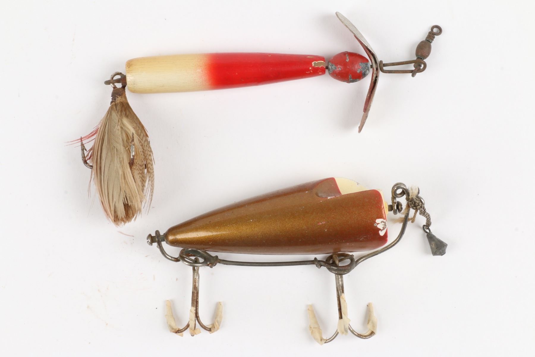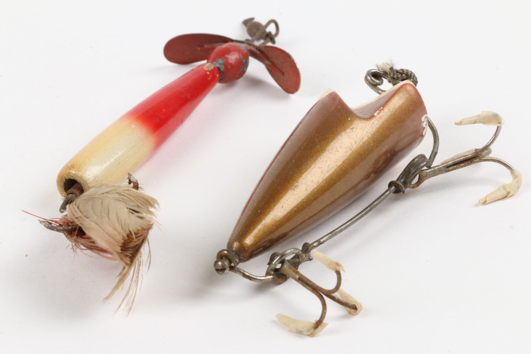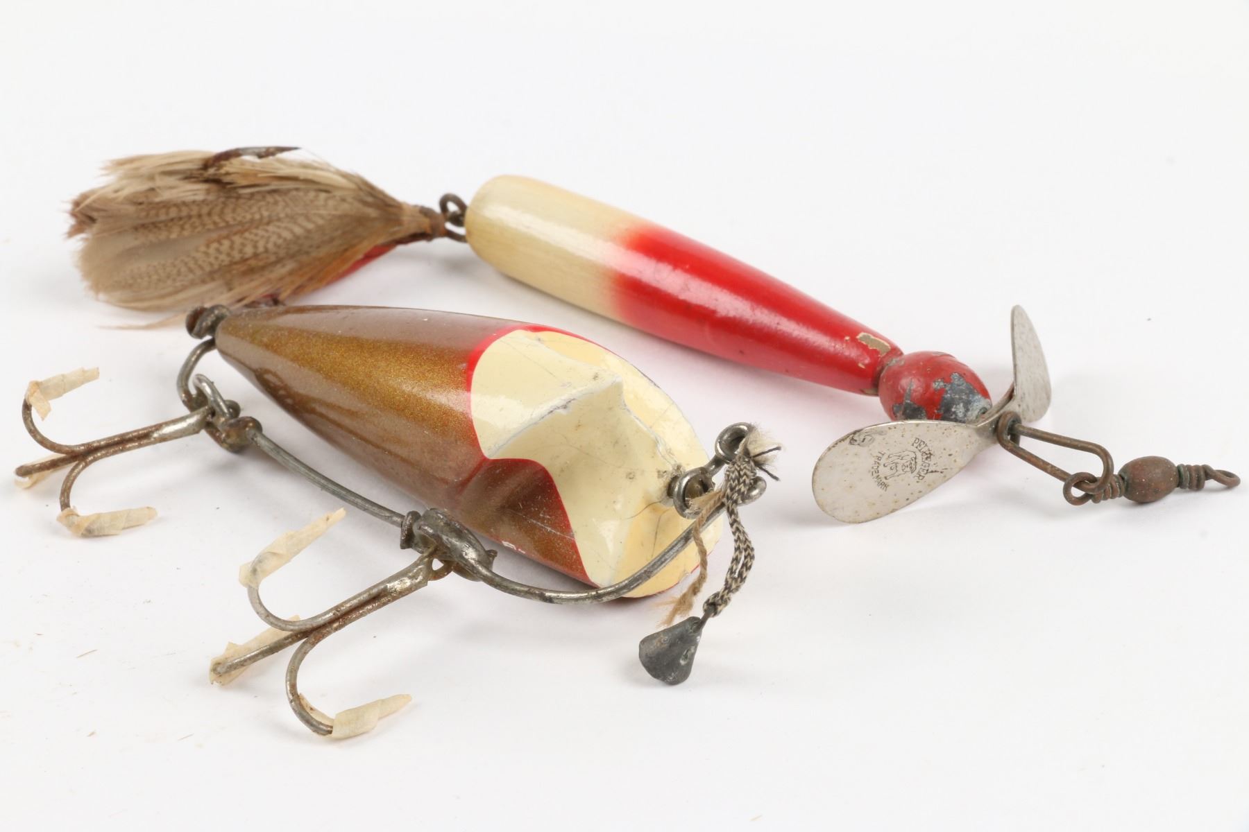 Bite-Em-Bait Co. Pflueger, United States. Material: Wood. Quantity: 2. Grade: G. 3" - 3.5" Est. $75-100.