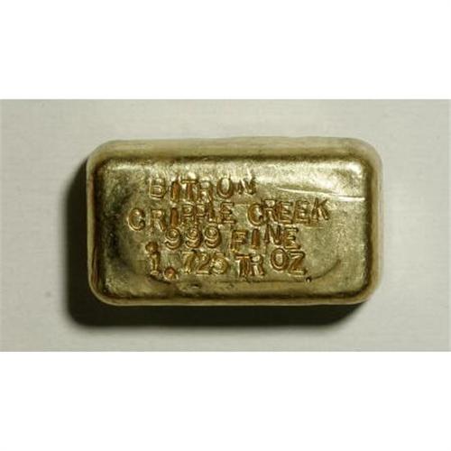 <B>Bitron Gold Ingot Uncertified.</B></I> A small yellow-gold ingot of modern manufacture. The top face is stamped BITRON/CRIPPLE CREEK/.999 FINE/1.725 TR OZ.<BR><BR><b>Shipping:</b> Coins & Currency (<a target="_blank" href="http://www.heritageauctions.com/common/shipping.php">view shipping information</a>\)