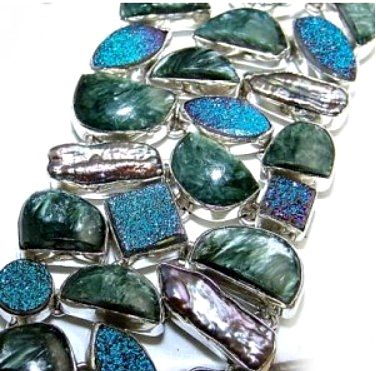 Silver & Biwa Pearl, Serphinite & Titanium Drusy Bracelet. Items are hand made as ordered so please allow 6 to 8 weeks for delivery.
