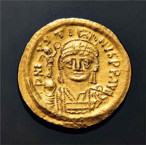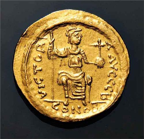 Monete Bizantine - Giustino II (565-578 d.C.) - Solido - Metallo: Au - Zecca: Costantinopoli - Diritto: effigie di Giustino II di fronte con globo niceforo e scudo - Rovescio: Costantinopoli seduta di fronte tiene un'asta e il globo crucigero - gr. 4,41 -