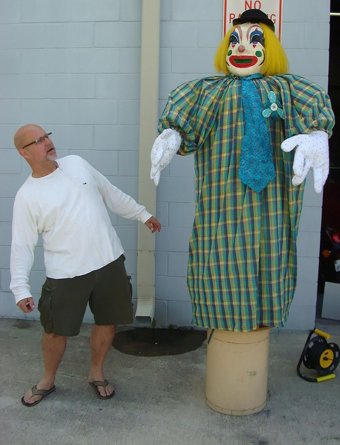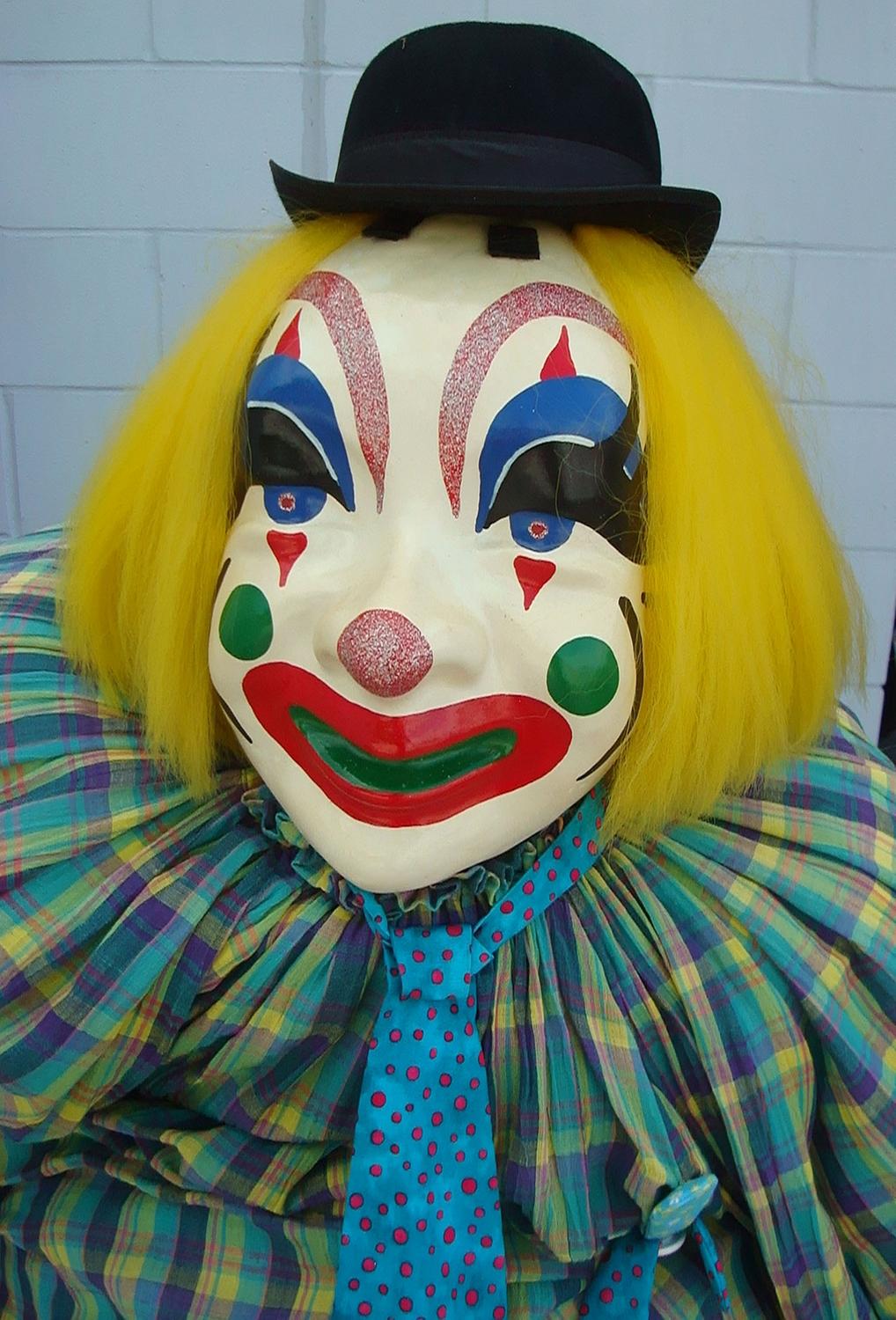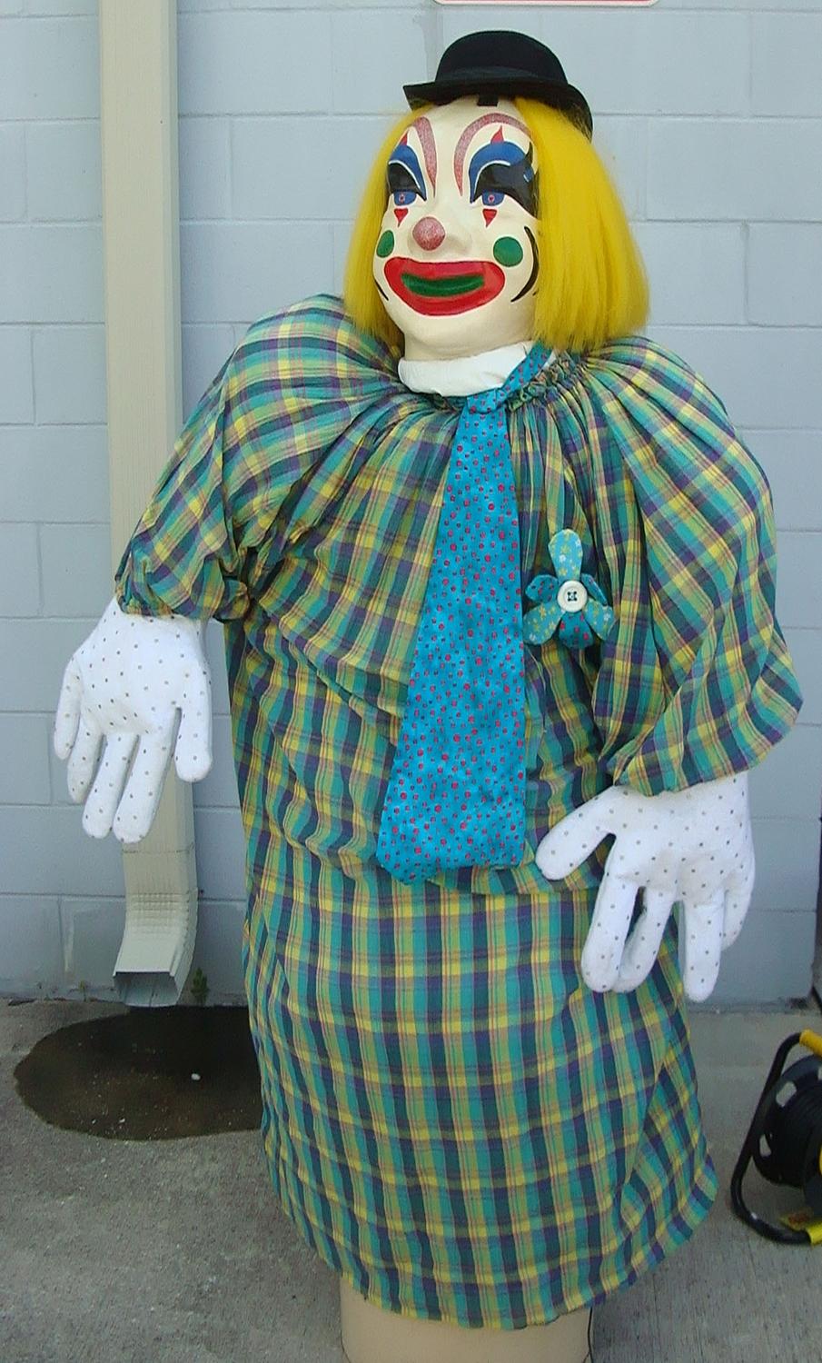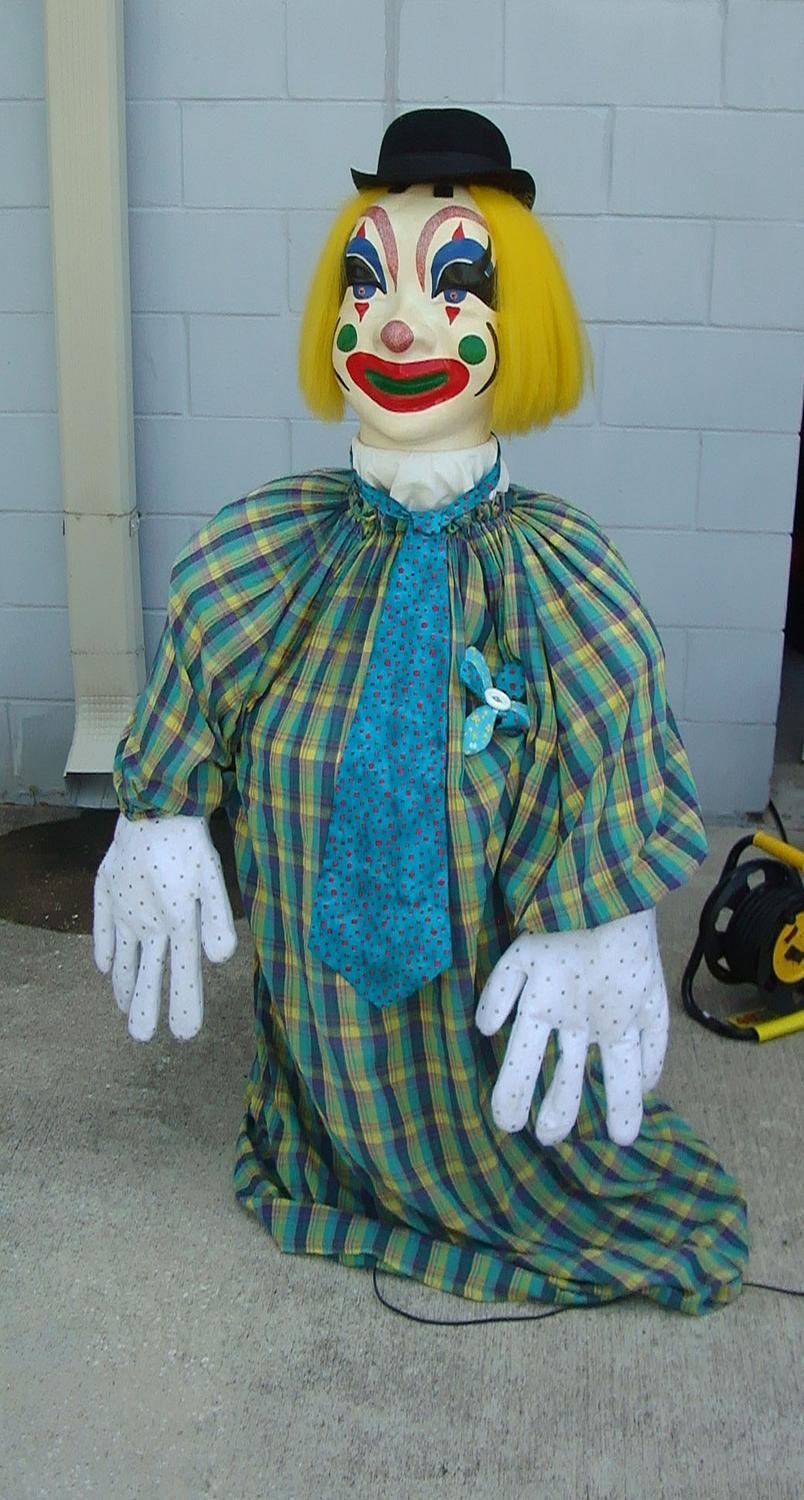 Early Carnival Circus Mechanical Clown. This Clown certainly grabs attention and a crowd with his rather unique continuous up and down motion which operates easily with any small air compressor. He rises to a colossal height of 85 inches during this process and turns heads and ears with the swooshing sound he makes. His tailored attaire is made of period muslin cotton and his face and features appear to be skillfully hand painted. Small children back in the day had to be traumatized by this clown as well as adults. And you can bet if author Stephen King owned a Clown it would be this one.