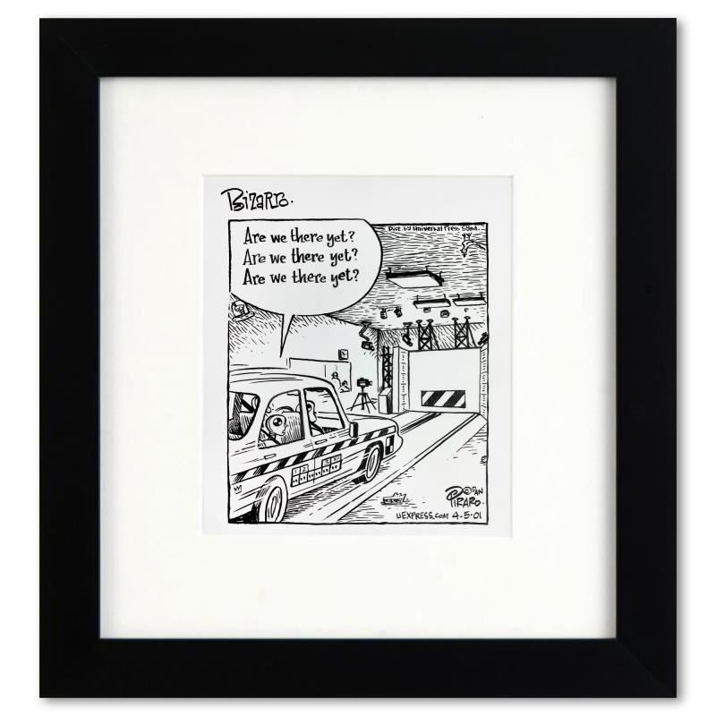 Enter a surreal and satirical world of twisted imagination and award winning creativity. "Are We There Yet?" is an original pen & ink drawing on paper by Dan Piraro, creator of the critically acclaimed and award winning comic strip, Bizarro. This piece is hand signed, comes custom framed and includes a letter of authenticity. Measures approximately 12" x 11" (frame), 7" x 6" (image).This item requires special handling and may have a longer than usual turnaround.