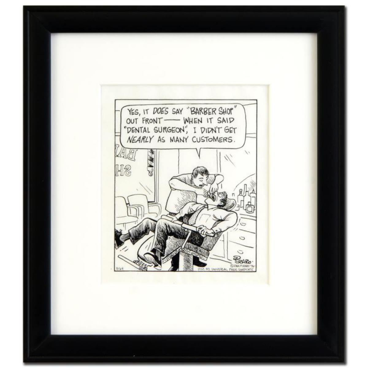 Enter a surreal and satirical world of twisted imagination and award winning creativity. "Barber Shop" is an original pen & ink drawing on paper by Dan Piraro, creator of the critically acclaimed and award winning comic strip, Bizarro! This piece is hand signed and comes framed. Includes Certificate of Authenticity! Measures approx. 13" x 14" (with frame), 6" x 7" (image). Reference #: 218052