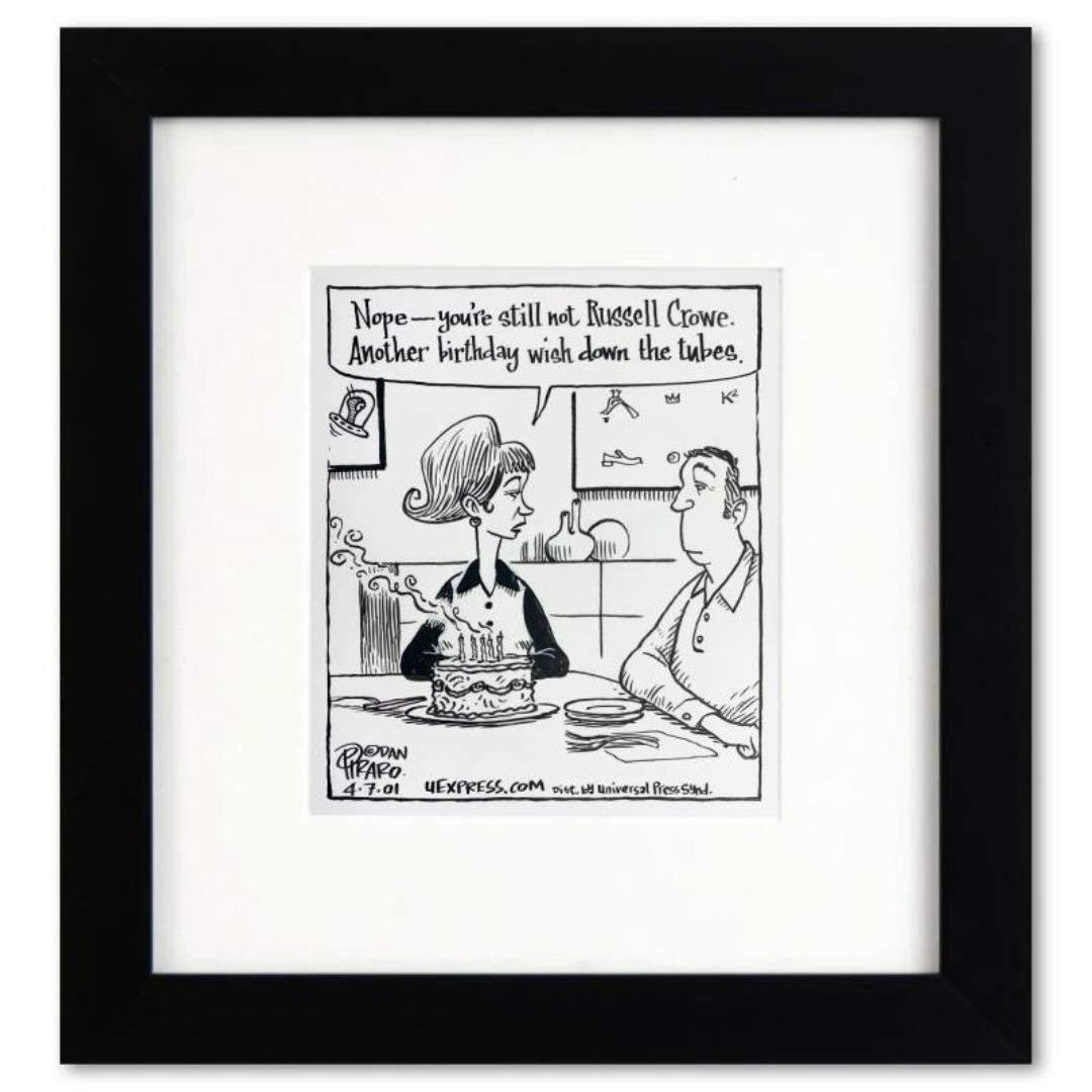 Enter a surreal and satirical world of twisted imagination and award winning creativity. "Birthday Wish" is an original pen & ink drawing on paper by Dan Piraro, creator of the critically acclaimed and award winning comic strip, Bizarro. This piece is hand signed, comes custom framed and includes a letter of authenticity. Measures approximately 12" x 11" (frame), 7" x 6" (image).This item requires special handling and may have a longer than usual turnaround.