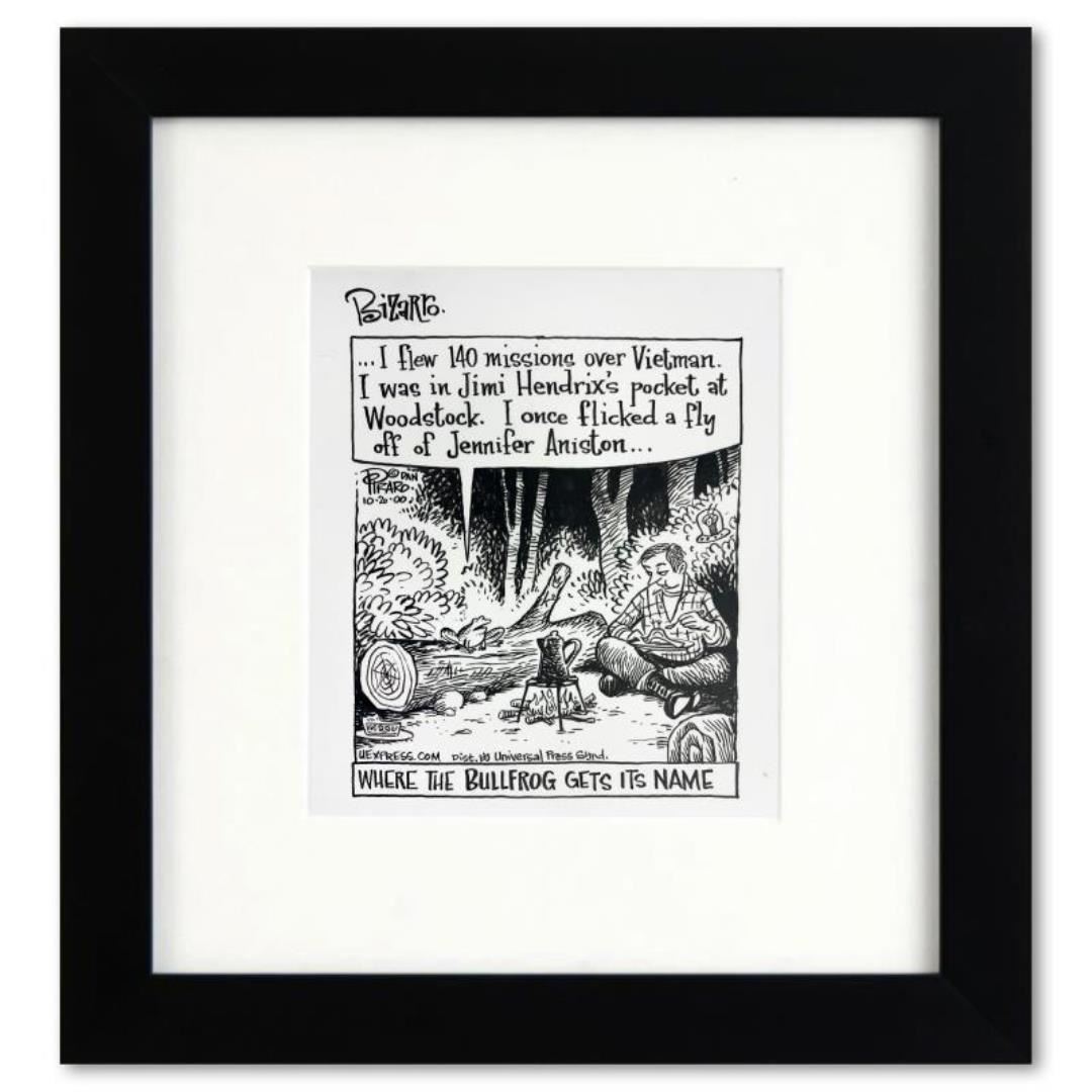 Enter a surreal and satirical world of twisted imagination and award winning creativity. "Bullfrog Name" is an original pen & ink drawing on paper by Dan Piraro, creator of the critically acclaimed and award winning comic strip, Bizarro. This piece is hand signed, comes custom framed and includes a letter of authenticity. Measures approximately 12" x 11" (frame), 7" x 6" (image).This item requires special handling and may have a longer than usual turnaround.