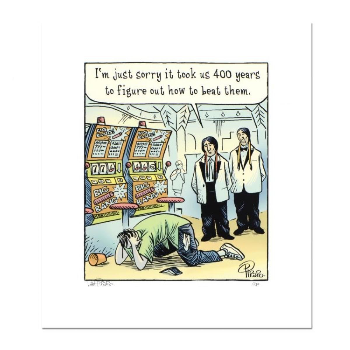 "Casino Indians" is a limited edition giclee on paper by Dan Piraro, creator of the critically acclaimed and award winning comic strip, Bizarro! This piece is numbered and hand signed by the artist and includes aletterof authenticity. Measures approximtely 12" x 10" (image).
