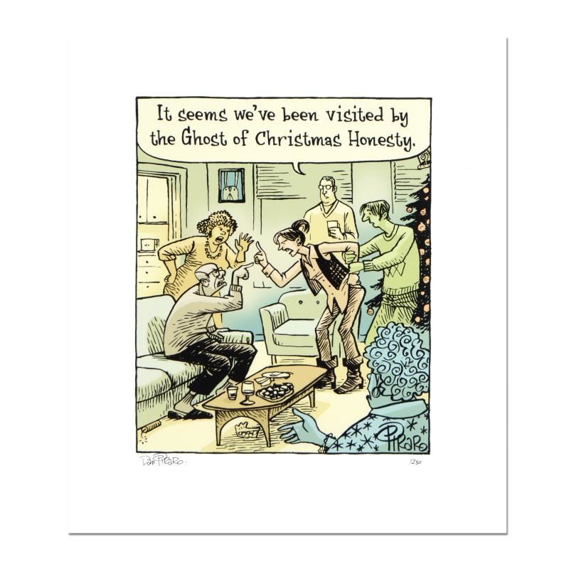 "Christmas Honesty" is a limited edition giclee on paper by Dan Piraro, creator of the critically acclaimed and award winning comic strip, Bizarro. This piece is numbered and hand signed by the artist and includes a letter of authenticity. Measures approximately 12" x 10" (image).