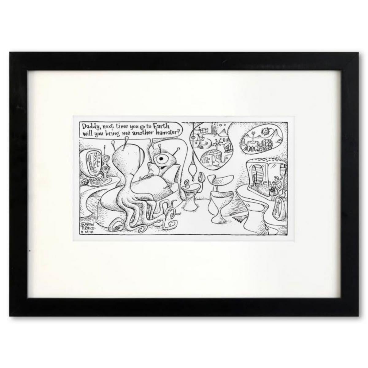 Enter a surreal and satirical world of twisted imagination and award winning creativity. "Earthling Hamster" is an original pen & ink drawing on paper by Dan Piraro, creator of the critically acclaimed and award winning comic strip, Bizarro. This piece is hand signed, comes custom framed and includes a letter of authenticity. Measures approximately 14" x 21" (frame), 7" x 13" (image).This item requires special handling and may have a longer than usual turnaround. Reference #: 255219
