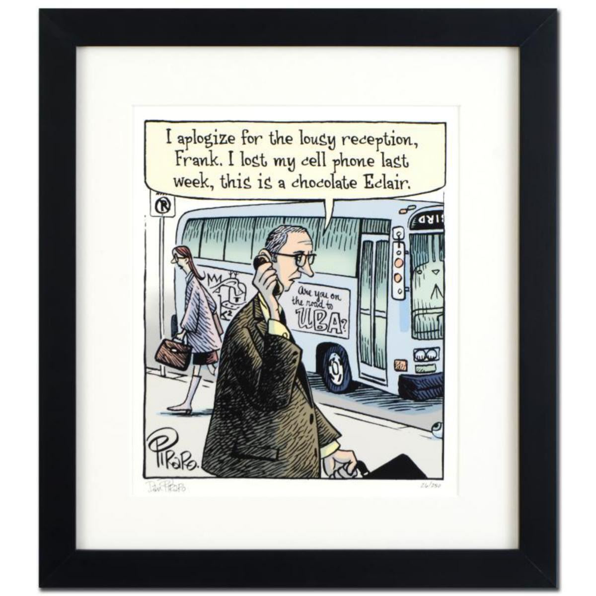 Enter a surreal and satirical world of twisted imagination and award winning creativity. "Eclair Cell Phone" is a limited edition giclee on paper by Dan Piraro, creator of the critically acclaimed and award winning comic strip, Bizarro! This piece is framed, numbered and hand signed by the artist! Includes Certificate of Authenticity! Measures approx. 17" x 19" (with frame), 9.5" x 11.5" (image). Reference #: 214168.