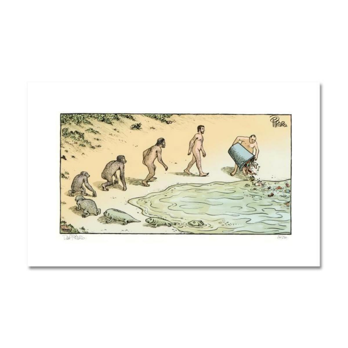 "Evolution Trash" is a limited edition giclee on paper by Dan Piraro, creator of the critically acclaimed and award winning comic strip, Bizarro! This piece is numbered and hand signed by the artist and includes aletterof authenticity. Measures approximtely 8" x 15" (image). Reference #: 240074.