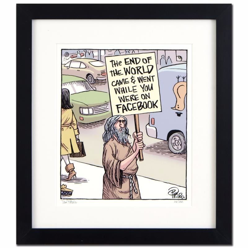 Enter a surreal and satirical world of twisted imagination and award winning creativity. "Facebook Prophet" is a limited edition giclee on paper by Dan Piraro, creator of the critically acclaimed and award winning comic strip, Bizarro! This piece is framed, numbered and hand signed by the artist! Includes Certificate of Authenticity! Measures approx. 17" x 19" (with frame), 9.5" x 11.5" (image). PRICE INCUDES FREE SHIPPING IN THE U.S. - SHIPPING WILL BE ADDED TO YOUR INVOICE FOR ALL BUYERS OUTSIDE OF THE U.S.